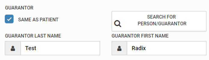 The user will be able to auto-populate information in the Guarantor Details section of the Patient Demographics page if the guarantor is an existing person in the system. The user can either select the “Same as Patient” radio button; or perform a search for an existing person.