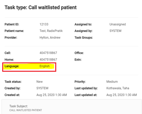 For all task types on the Task Details modal, the patient’s primary language will now be displayed below the “Home Phone” field. Inclusion of this information will particularly benefit the users that work on “Call Waitlisted Patient” tasks, as they will now be able to identify the language that can be used for communicating with the patient. The newly added “Language” field will be in sync with the “Language” information displayed on the Patient Demographics page (i.e., any updates made to the patient's language on the Demographics page will be reflected on the Task Details screen.